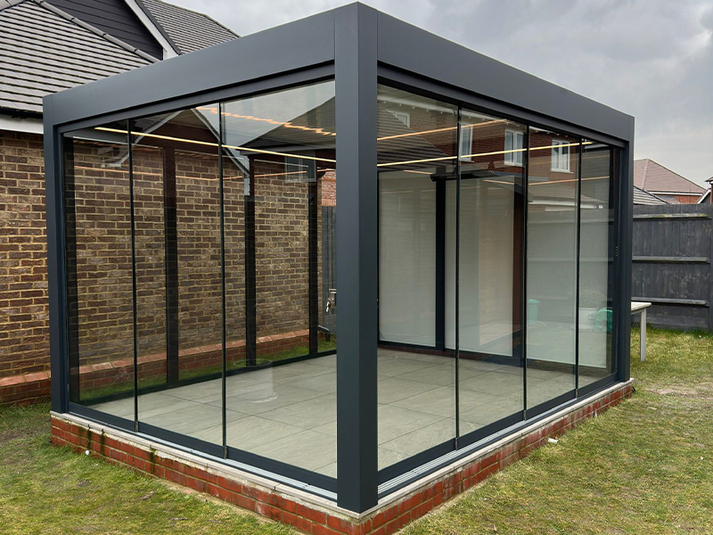 <b>The Brief</b><br>The client required a free-standing outdoor structure that provided maximum flexibility in airflow and privacy. They wanted a pergola with an openable roof and sides to allow for full ventilation while also incorporating a privacy screen and heater to enhance comfort and usability in various weather conditions.<br> <b>The Solution</b><br>The Louvre Pod Pergola in Anthracite Grey with Light Grey blades was the ideal choice to meet the client's requirements. This sleek and modern structure provides a perfect balance of shade, shelter, and open-air functionality.<br> To maximise versatility, the pergola features a fully openable roof and sliding glass doors, allowing the client to customise the space depending on the weather and their preferences. The integration of a white drop-down privacy screen adds an extra layer of comfort, offering seclusion when needed while maintaining the open aesthetic.<br> For added functionality, perimeter strip lighting was installed, ensuring the space is usable both during the day and in the evening. The inclusion of a heater enhances the year-round usability of the pergola, creating a cosy and inviting atmosphere even in cooler temperatures.<br> This installation has successfully transformed the client's outdoor space into a flexible and stylish retreat. Whether used for relaxation, dining, or entertaining, the Louvre Pod Pergola provides the perfect combination of modern design, comfort, and adaptability.