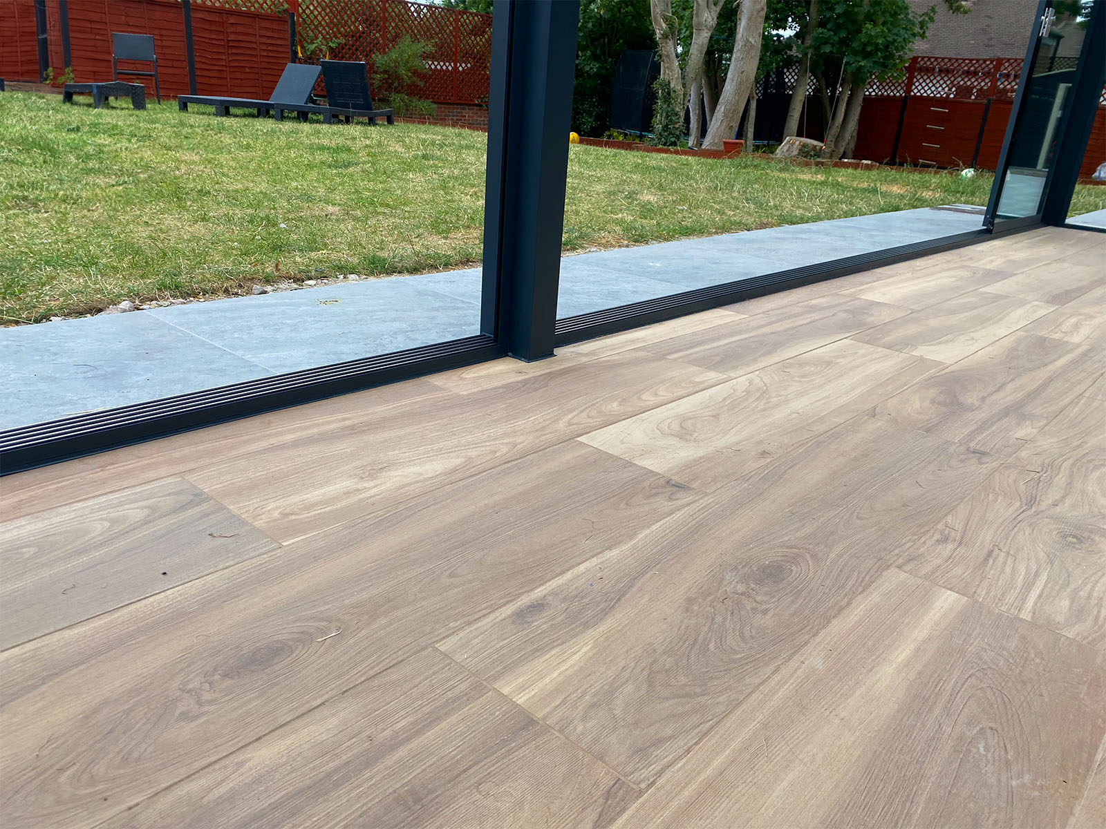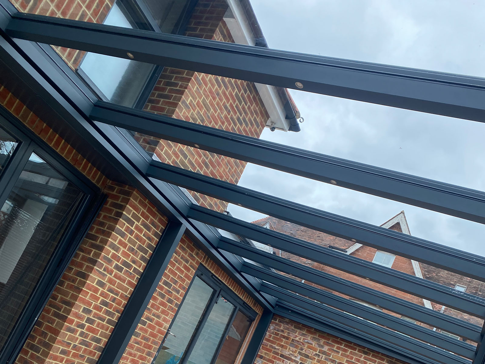 <b>The Brief:</b><br> Our client envisioned a sleek and modern glass room to enhance their outdoor space while seamlessly blending with the contemporary aesthetic of their property. The structure needed to provide distinct zones for both dining and relaxation, offering versatility for entertaining and everyday use.<br> <b>The Requirements:</b><br> The installed glass room needs to be able to span 8.5 meters in width and 3.5 meters in projection to accommodate both a dining area and a living/relaxation zone. The space will need to be versatile to allow full access to the garden in good weather. The design will need to offer a modern aesthetic which incorporates the Anthracite Grey of the existing windows. <br> <b>The Solution:</b><br> After consulting with the client, the Vue Pod was chosen as the ideal solution, offering a sophisticated design and advanced features. <br> The custom-bulit Vue Pod was able to span the required 8.5 meter width by 3.5 meter projection, providing ample room to create two distinct zones: a dining area at one end and a living/relaxation area at the other. In order to compliment the modern style of the home and match the existing windows the structure has ben installed in Anthracite Grey.<br> Sliding glass doors were installed on two sides of the glass room, allowing easy access to the patio and garden. When fully opened, these doors transform the space into an open-air extension of the home, ideal for enjoying pleasant weather. To accompany the glass doors, sliding shutter panels were integrated to enhance both design and functionality, offering privacy and additional control over light when needed.<br> Dimmable rafter lighting was installed to provide functional yet atmospheric illumination for the space. The lighting can be adjusted to suit different moods, and create an ambiance when entertaining.
